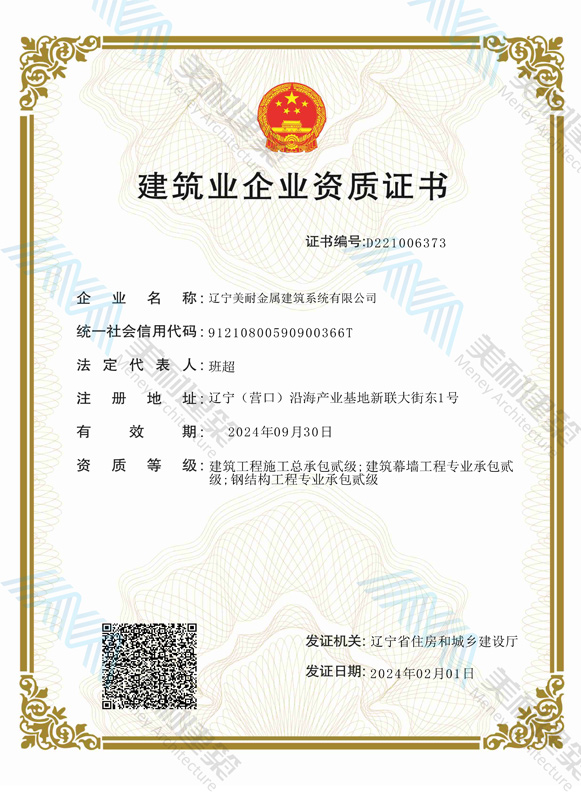 辽宁美耐金属建筑系统有限公司位于辽宁(营口)沿海产业基地,专注于预制金属建筑系统领域,是一家集工业建筑设计、制作、施工及相关的技术咨询与服务为一体的综合性服务企业。作为国家钢结构协会会员、中国建筑金属结构协会会员单位与国家高新技术企业,美耐建筑集建筑工程施工总承包、钢结构工程专业承包等多种资质于一身,并拥有22项钢结构建筑领域专利,9项软件著作权。